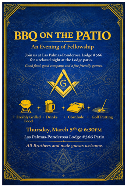 Copyright © 2013-2026 Las Palmas-Ponderosa Lodge No. 366, Free and Accepted Masons of California. All Rights Reserved. Nothing contained in this website can be used for any Baptism, sealing or other religious purpose. This is the only official web-site of Las Palmas-Ponderosa Lodge No. 366 F & A.M. Fresno, California. No pictures or stories on this website may be reproduced or otherwise distributed without prior express written permission from Las Palmas-Ponderosa Lodge No. 366 F. & A. M. Last updated February 13 2026